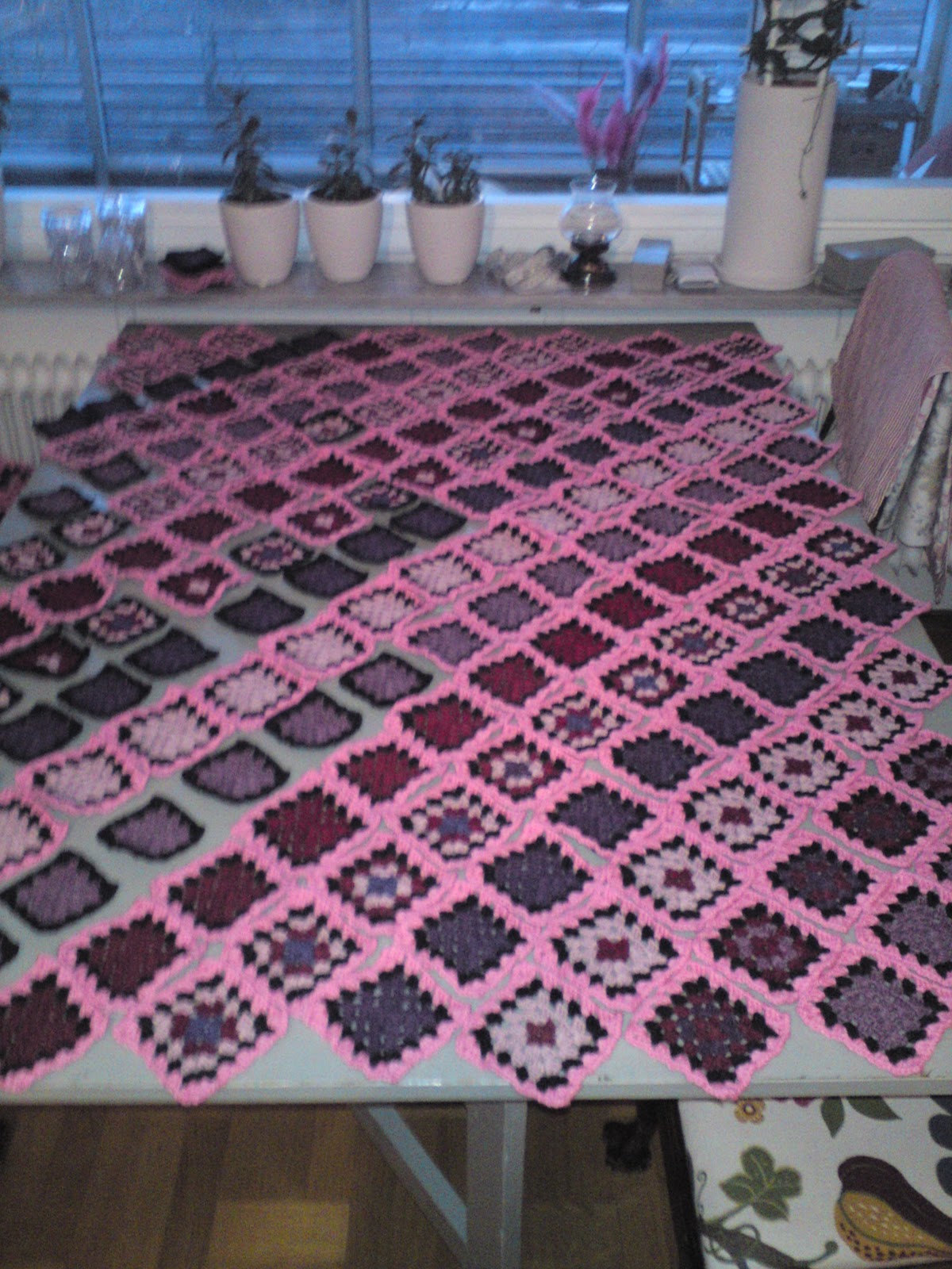 Här ligger den på matbordet och bara väntar på mängder av små stygn. Det tog ett tag innan jag hade fått ordning på hur rutorna skulle ligga. För som sagt, det kan man hålla på med i en mindre evighet. Till slut bestämde jag mig för att "såhär får det bli!"